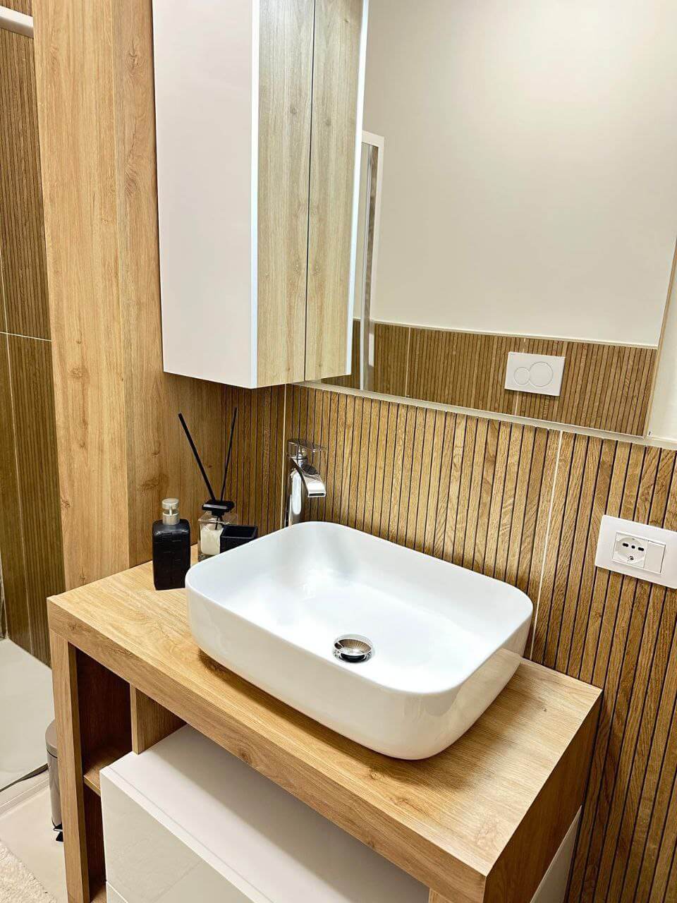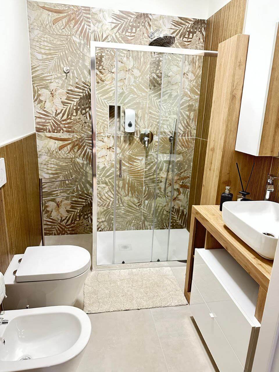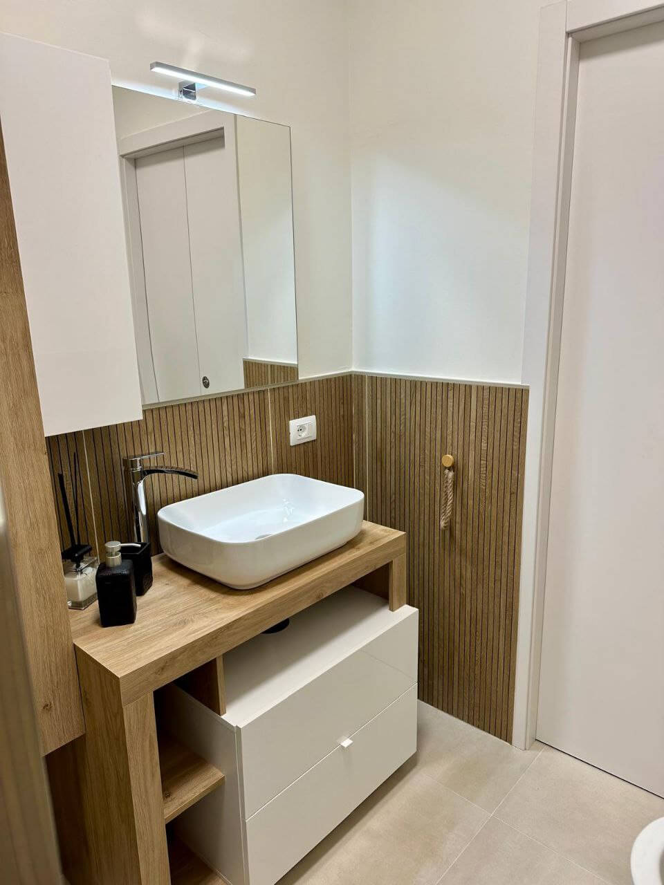 Un bagno intimo e curato, dove luci soffuse e dettagli delicati creano un’atmosfera rilassante.